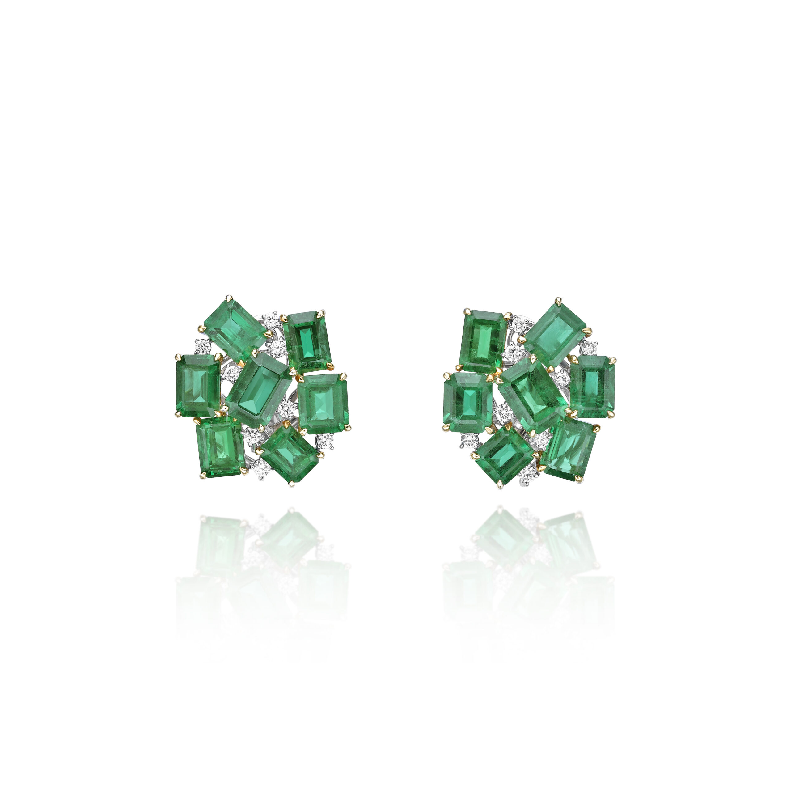 Introducing our Emerald Cluster Earrings, totaling an impressive 14.49 carats. Set in a beautiful combination of 18K white and yellow gold, these earrings are a stunning expression of elegance and sophistication.