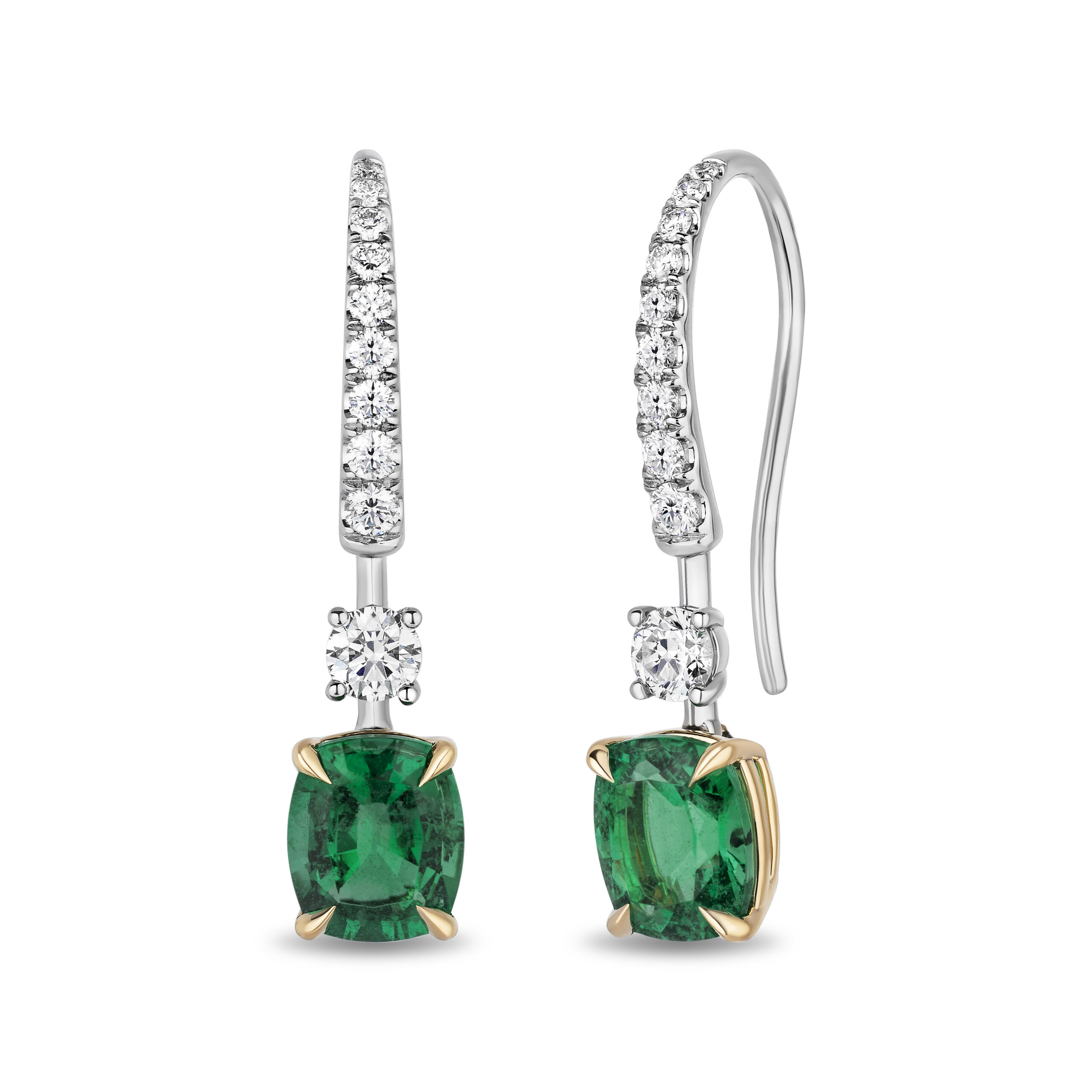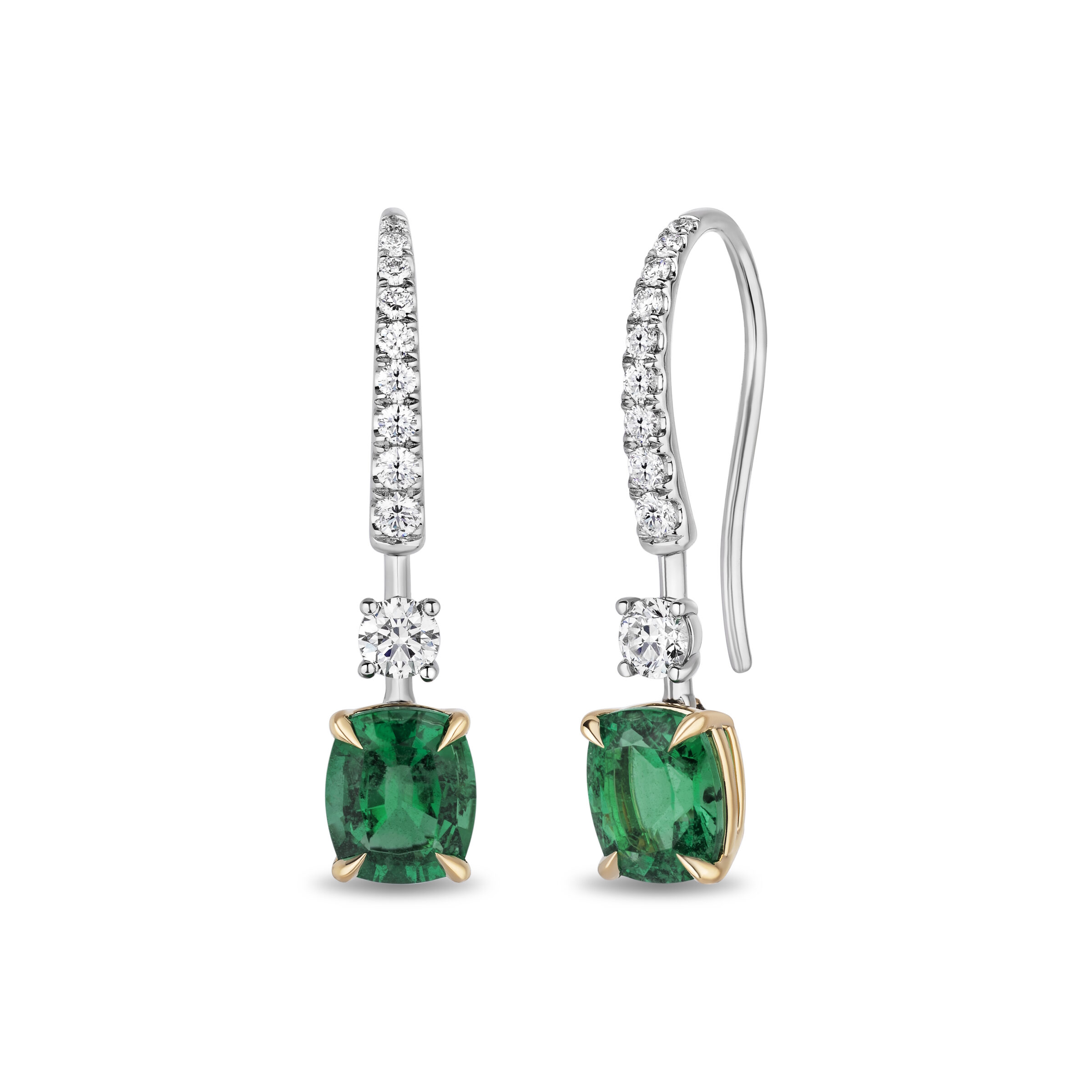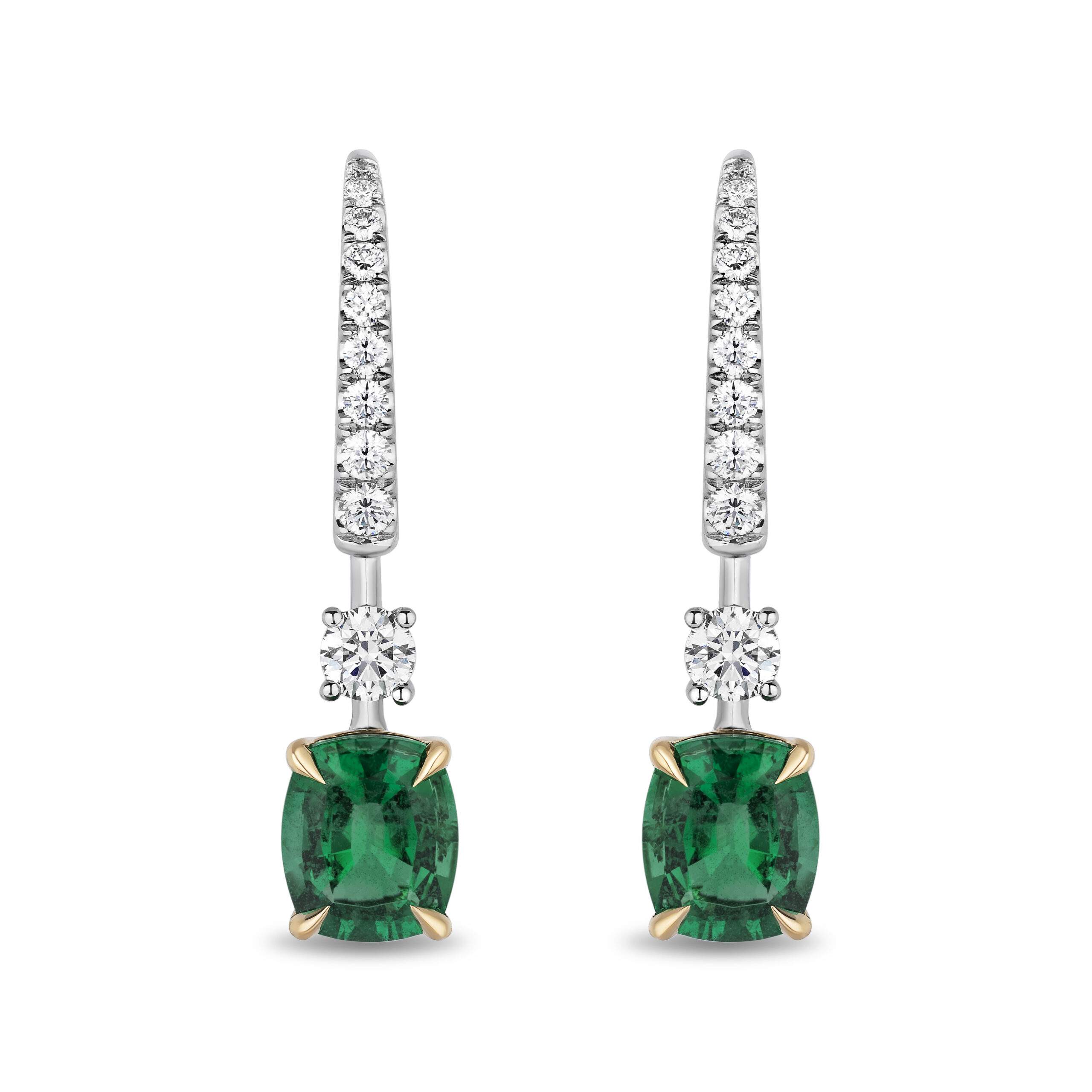 A one-of-a-kind creation of timeless elegance and striking contrast. Featuring GIA-certified emerald-cut emeralds totaling 2.69 carats, these vibrant green gems are cradled in 18kt yellow gold four-claw prongs with a delicate open basket gallery. The refined hook and upper structure are paved with 0.62 carats of brilliant white diamonds, set in platinum for a sleek, radiant finish. With a total weight of 4.930 grams and 3.31 carats of gemstones, this dual-metal masterpiece balances opulence with sophistication. Perfect for both black-tie evenings and modern statement wear.