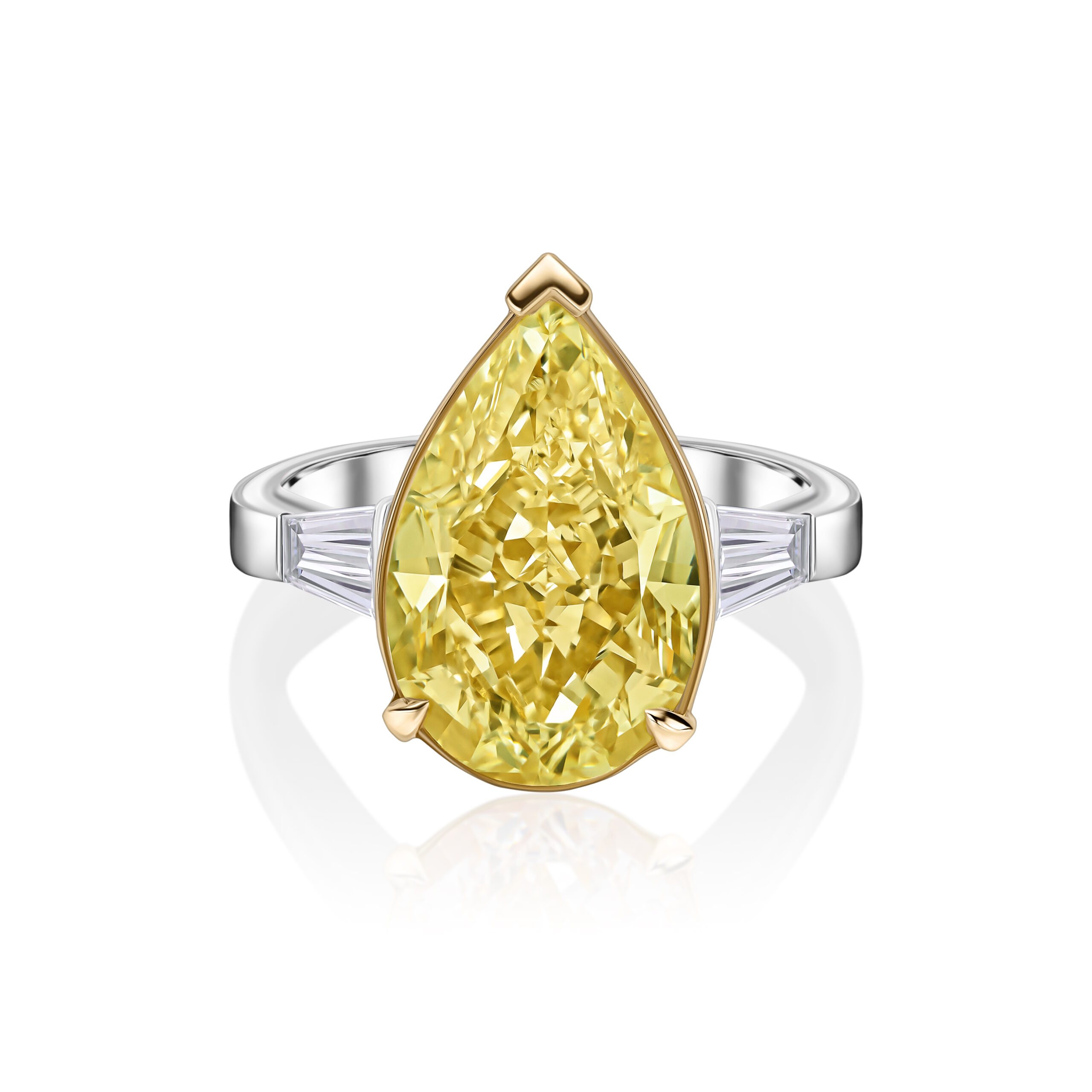 Featuring an exquisite Yellow Pear-shaped diamond ring. The center stone consists of a mesmerizing bezel-set 9.14 carat pear-shaped diamond certified by GIA with a color range from W – X and VS2 clarity. There are two tapered baguette diamonds with a total weight of 0.74 carats of F color and VS+ clarity flanked on the sides of the center stone, on an 18kt white gold setting. The total weight of diamonds are 9.88 carats making it a very elegant statement piece.